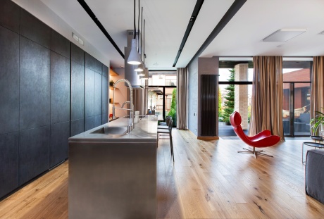 • контраст материалов и фактур: дерева, бетона, камня, керамогранита с эффектом ржавого металла