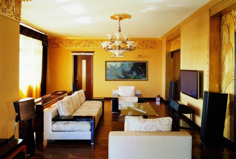 стеновые панели, декоративные рамы, мебель со сглаженными углами из палисандра и эбенового дерева