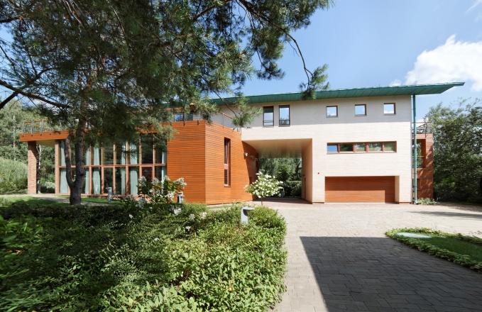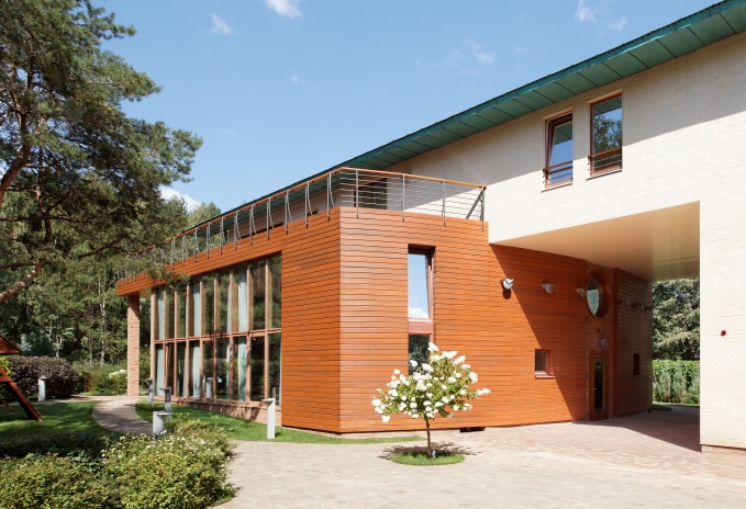 Архитектурный и ландшафтный проекты для этого загородного дома разрабатывались архитекторами Юлией Вишнепольской и Андреем Карцевым с учетом небольшого размера и сложного рельефа участка, что определило выбор модернистской концепции. Гостевой и приватный блоки разнесены по отдельным архитектурным объемам, и это функциональное разделение дополнительно акцентировано в контрастной отделке фасада. Гостевой блок зашит вагонкой из лиственницы, а фасадные поверхности приватного блока облицованы белым кирпичом, который гармонично дополняет светлую тротуарную плитку. Облицовочный кирпич предоставлен на проект компанией Кирилл.