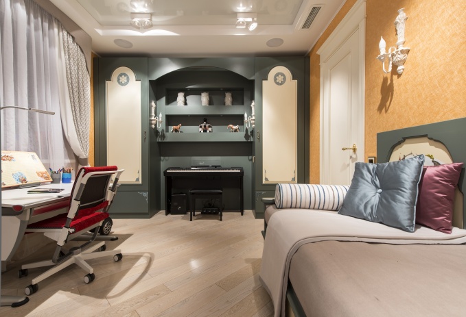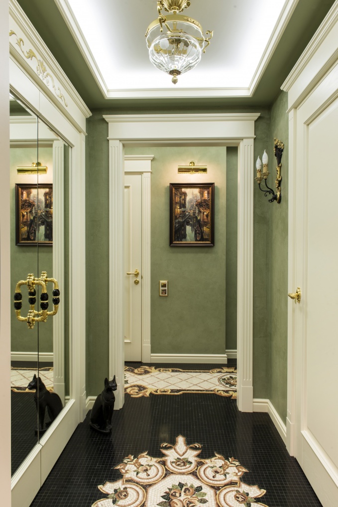 Классические декорации, плотный театральный декор и насыщенная цветовая гамма – таким способом дизайнеры Марк и Анна Гусарова решили отвлечь внимание от сложной пространственной конфигурации квартиры, обеспечить гармоничную смену интерьерных планов и сформировать атмосферу фамильного исторического особняка. Яркую колористику, католический стилистический акцент во многом определила привезенная из путешествия и расположенная в прихожей скульптура Девы Марии Гваделупской. Дверная фурнитура на проекте – испанский бренд Mestre, специализирующийся на дворцовой классике с финишем под старину.