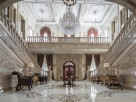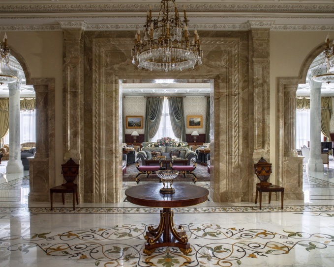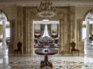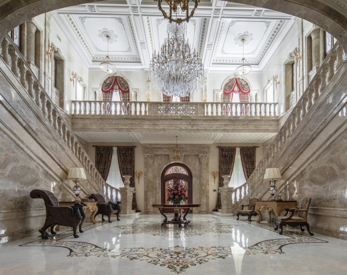 Коллекция великолепных реплик старинной мебели в стиле традиционной английской классики в интерьере ориентального палаццо производит, конечно же, неизгладимое, и при этом двойственное впечатление. С одной стороны, как будто экзотика – место действия Ближний Восток, а с другой стороны, все на своем месте – это же роскошный мраморный дворец! Для оформления парадной входной группы и просторного холла идеолог проекта Ольга Кушнарева-Леоне выбрала мебель в историческом стиле от Theodore Alexander. Столы с львиными лапами, кресла-грифоны, дубовый сундук, стул эпохи Георга III – меблировка музейно-галерейного уровня!