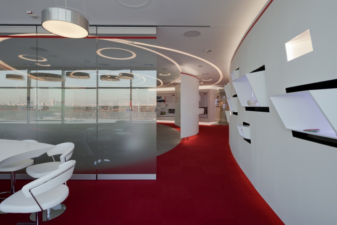 Интерьер следовало решить в современном ключе с использованием цветовой символики компании.