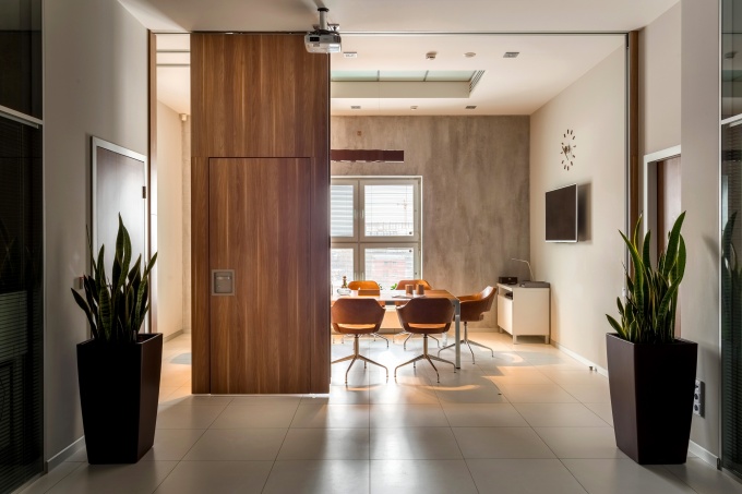 Помимо естественного света для переговорных комнат можно использовать люминесцентные светильники с идеальной цветопередачей. Техническое оснащение не должно портить общего впечатления от интерьера. Лучше всего, когда оно встроено в мебель.
