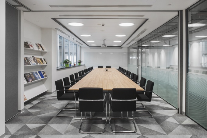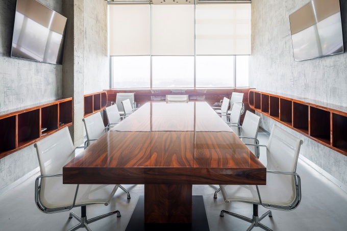Наиболее распространенное решение – просторное помещение, рассчитанное на значительное число людей. Ключевые элементы обстановки – конференц-стол и офисные кресла.