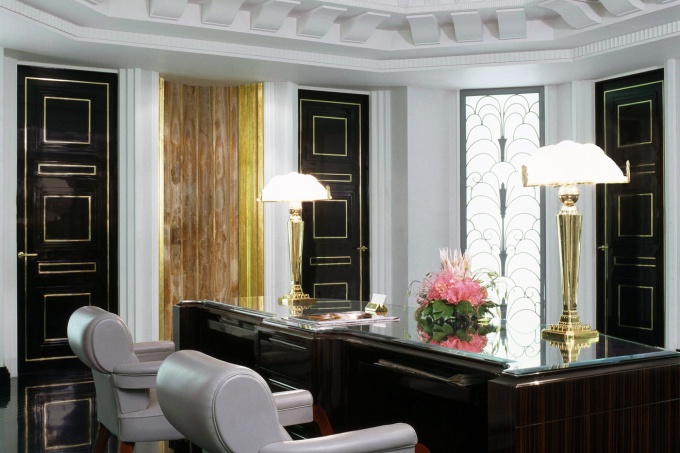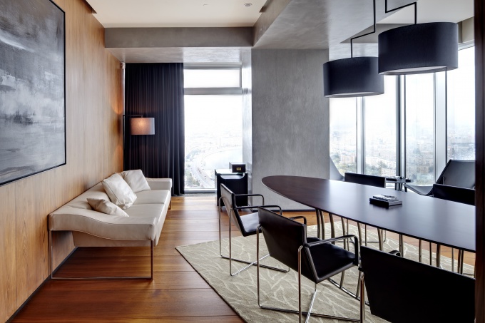 Высокий статус и интеллигентность подчеркивается использованием натуральных материалов с интересной фактурой: дерева (ореховые панели), сланца, полированных поверхностей и мебели от именитых итальянских фабрик.