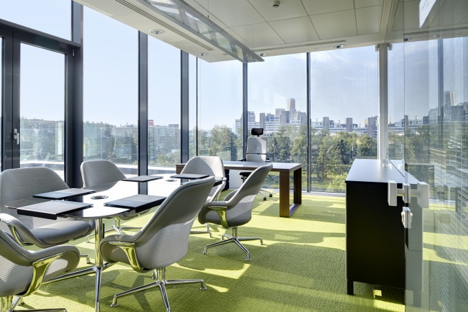 Московский офис корпорации Siemens расположен в современном 6-этажном здании с двухуровневой подземной парковкой в самом центре Москвы, на Большой Татарской улице. При работе над его интерьерами следовало, с одной стороны, соблюсти все нормы жесткого корпоративного стиля, а с другой – избежать стандартных решений. Центральный архитектурный элемент пространства – роскошный световой атриум с внутренними стеклянными фасадами рабочих зон, именно вокруг него архитекторы бюро ABD Architects построили концепцию оформления интерьеров.
