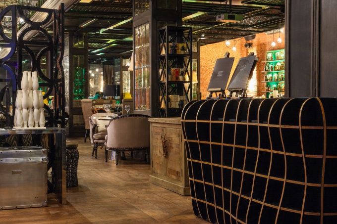 Расположилось заведение на месте восточного ресторана «Килим», от которого оно унаследовало кирпичные стены, деревянные ширмы-панели, арочные зеркальные потолки, открытые коммуникации и значительную часть мебели. Поэтому работать над образом запоминающегося, комфортного и остроумного заведения, куда хочется возвращаться, дизайнеру пришлось исключительно декораторскими средствами. В итоге получился интерьер, аналогов которому в Москве не сыщешь, его эклектичная стилистика намеренно доведена почти до грани китча.