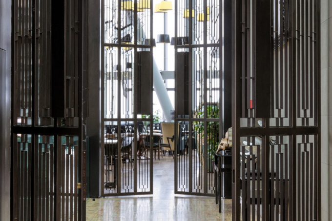 С той лишь разницей, что из панорамных окон открывается впечатляющий вид на московскую перспективу начала XXI века. Перед дизайнером Юной Мегре, создавшей этот яркий и стильный интерьер, стояла непростая задача – декорировать пространство, доставшееся от отеля For Seasons, который сначала планировал открываться на этом месте. Именно от него остались роскошные, но столь разноплановые элементы: входные двери в стиле ар-деко из металла, полы из древесины оливы, настенные панели из шпона березы, эбенового дерева и замши, зеркала из гранита, более двух десятков живых берез в кадках и огромное холодное пространство под высочайшим стеклянным куполом… Важно было не просто соединить декоративные элементы в цельный ансамбль, но создать атмосферу уюта в большом открытом стеклянном объеме.