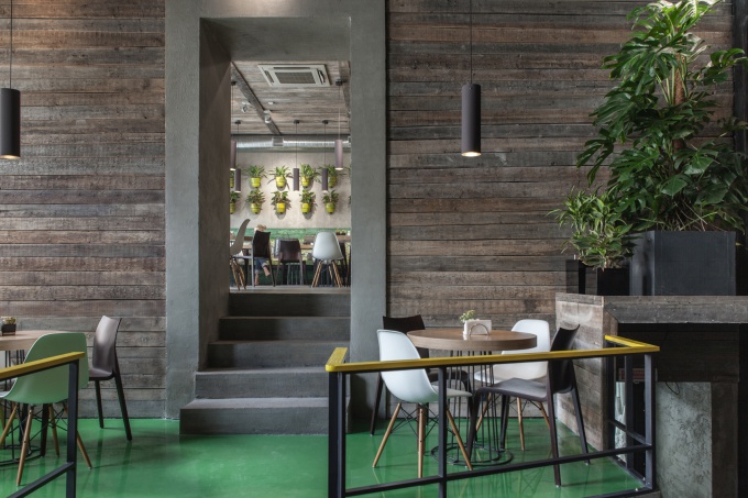 Интерьер веганского кафе Fresh выполнен в экологической стилистике в полном соответствии с концепцией заведения. Работая над проектом, дизайнеры стремились уйти от этнических стереотипов, прочно связанных с вегетарианскими местами, и создать стильное заведение с дизайнерскими «фишками», где одинаково уютно себя бы чувствовали и вегетарианцы, и мясоеды.
