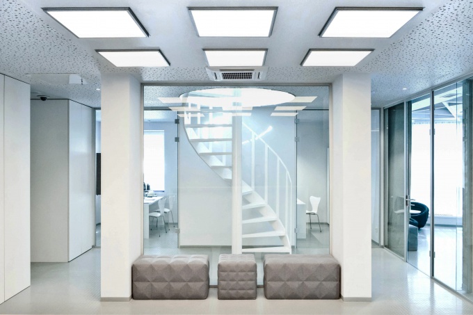 Для питерской компании Iridato Group, чей профиль – организация бизнеса, подбор и обучение персонала, архитектурное бюро Archi-Do создало инновационный офис. Стерильно белое пространство с огромным стеклянным куполом, открытой верандой с круглыми креслами-качелями из пластика, прозрачным стенами из «умного» стекла, авторской мебелью и арт-объектами стилизовано под космическую станцию.