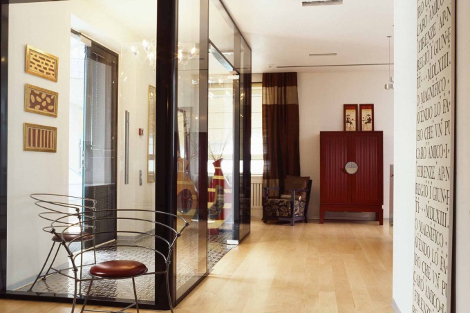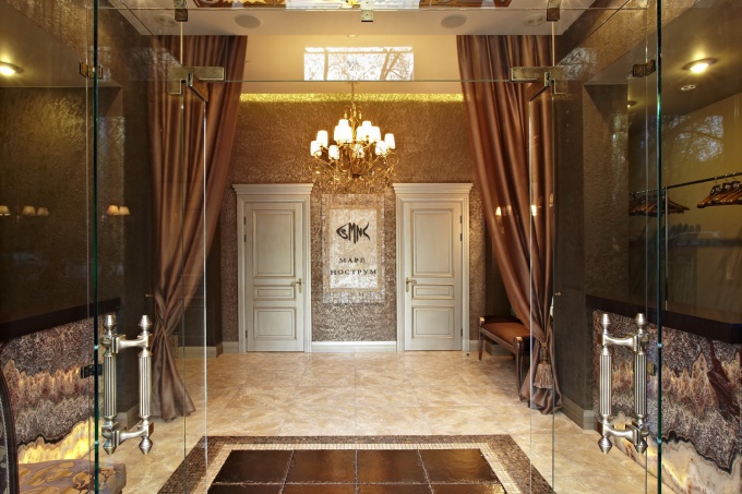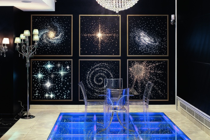 Перед архитекторами стояла задача в помещении с высокими потолками спроектировать салон-магазин, где представлены оптоволоконные светильники, люстры, панно и аксессуары из стразов Swarovski.