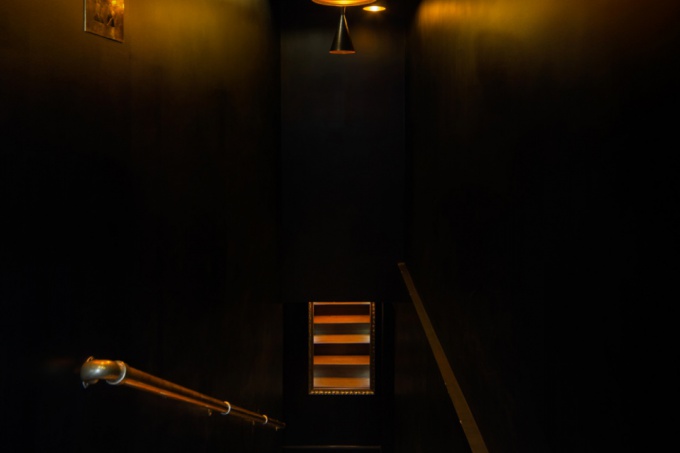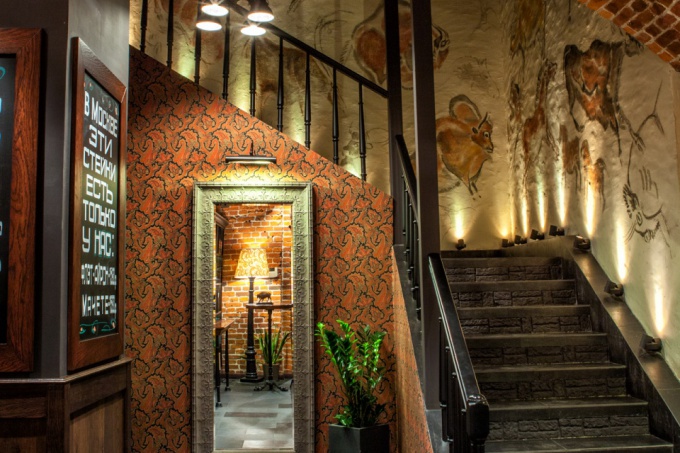 В процессе работы они не только вернули помещению с арочными переходами первозданный вид, но очистили каждый кирпичик вручную. В дополнение к старинному кирпичу они использовали роспись под наскальный рисунок, светильники из черненого металла, кожаные диваны и массивные скульптуры из чугуна.