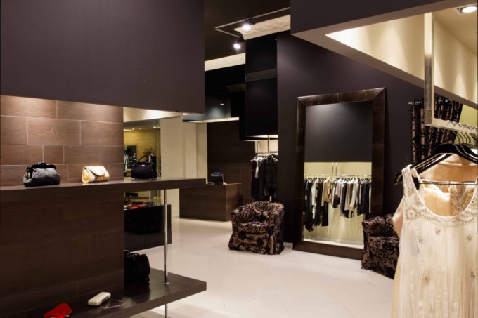 Салон женской одежды в стиле неоклассика расположен в торговом центре. Его отличительная особенность – плотная шоколадная цветовая гамма и гипсовый декор в духе ампира. Верхние светильники, освещающие торговое оборудование с одеждой, забраны в высокие короба из гипсокартона. Они широким кантом акцентируют периметр помещения.