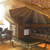 При создании эскизов авторской кованой мебели для ванной комнаты дизайнер Каролина Мозговая отталкивалась от восточной стилистки дома. Именно поэтому в рисунке кованых подстольев в главном и детском санузлах читаются традиционные казахские орнаменты, адаптированные под современность. Особое внимание привлекает кованая консоль в большой ванной комнате: изящное воздушное кованое изделие поддерживает массивную столешницу длиной 1,40 метров из индийского мрамора.