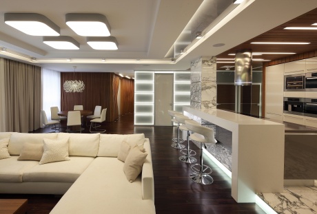 ДальшеПри оформлении трехкомнатной квартиры в стиле современной классики дизайнер Екатерина Ефанова сделала ставку на цвет. В качестве фонового колора общественной зоны она использовала сложный оттенок сине-бирюзового цвета, будто слегка припыленного, освежающего и прохладного. Чтобы благородная бирюза читалась еще активнее, двери, дверные порталы, кухонный гарнитур, часть корпусной мебели решены в белом цвете. Такой контраст придает пространству определенную строгость, но в то же время создает парадный настрой.