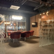 Витражный атриум – главная архитектурная особенность БЦ Верейская плаза. На витражах выгравирован рисунок старинного здания с кирпичной кладкой. Именно эту идею застройщика архитектор Юрий Емельяненко (бюро EMELYA) поддержал в оформлении интерьера офиса с помощью облицовочного кирпича. Для этой цели использован красно-коричневый кирпич российского бренда Донские Зори, модель Амстердам формата WF (210х100х50 мм). Кирпичная отделка как единый декоративный мотив связывает обе интерьерные зоны офисного помещения (входная группа+рабочая зона, переговорная) площадью почти 100 кв. м.
