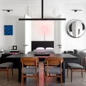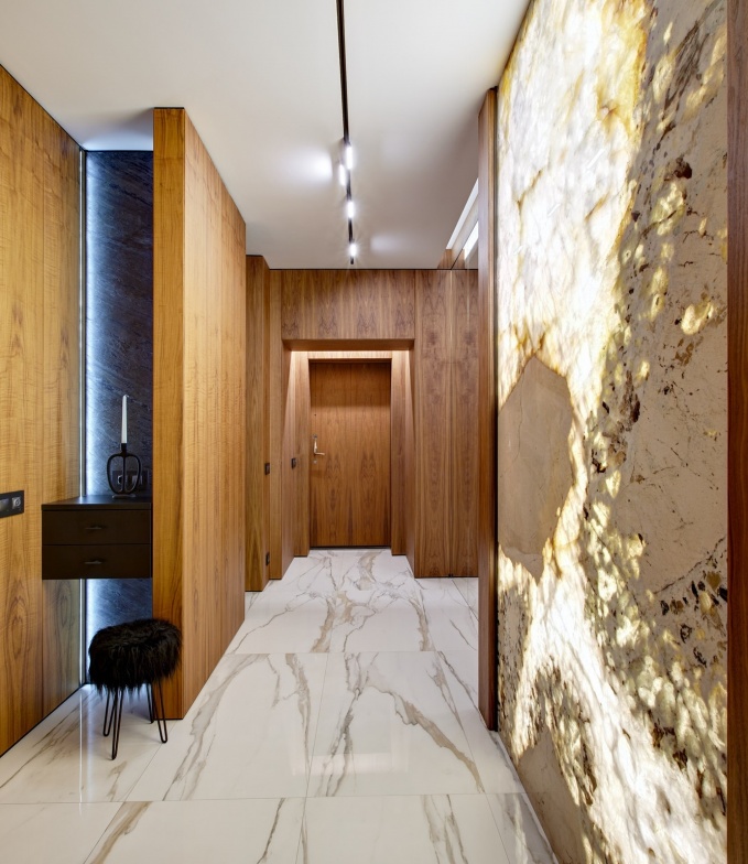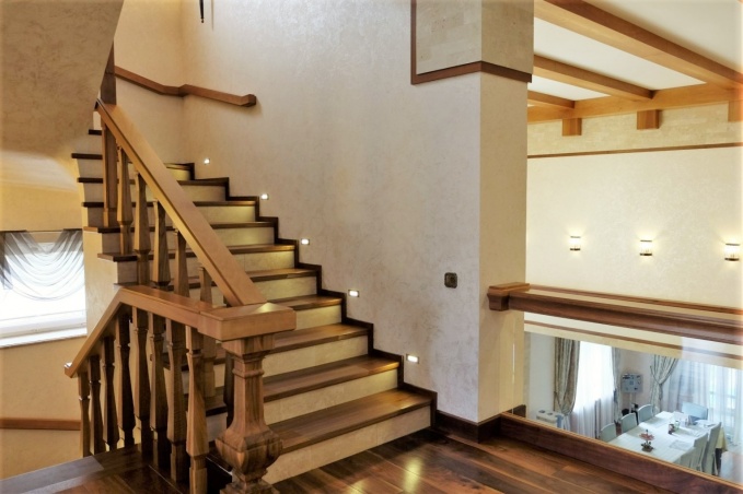 ДальшеЧетырехэтажный кирпичный дом с мансардой дизайнер Татьяна Чичуа оформила в стилистике неоклассики с элементами итальянского кантри. На площади 550 кв. м ей удалось разместить парадный этаж, приватный этаж и мансарду со спальнями, а также оборудовать цокольное пространство под бильярдную и зону отдыха. Центральное помещение в доме – каминный зал со вторым светом и симметричными высокими окнами. Чтобы подчеркнуть солнечное настроение Юга Италии, в оформлении стен дизайнер применила декоративную штукатурку с фактурой шелка и плиты из натурального песчаника. В проекте использовано большое количество разнообразных столярных изделий: двери, порталы, ограждение лестницы, потолочные балки, обрамления стен, а также корпусная мебель (библиотека) и композиция аквариума. Они выполнены из древесины ореха мастерами «Столичной Столярной Компании».