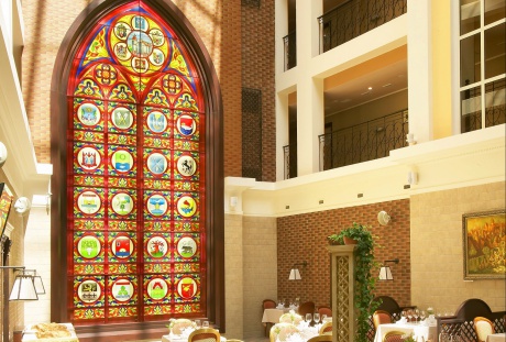 Задача - создать уютную атмосферу, изменив центральную часть холла отеля, расположенную между четырех колонн, не затрагивая отделку по периметру, интегрировать в существующую планировку лобби-бар. Плавные линии нового логотипа отеля подсказали идею создания волнообразного акцентного узора с легким восточным характером. Для придания холлу уюта были выбраны золотистые, охровые, терракотовые тона. Колонны сделали выразительнее с помощью мраморной отделки из Verde Rameggiato со вставками из оникса Onice Nuvolato Extra с интегрированной подсветкой. Логотип также из оникса с подсветкой. Чешуйчатый рисунок консолей поддерживает сочетания плавных линий и создает легкий экзотический эффект.