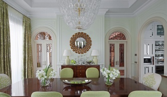 Зона столовой – одна из самых консервативных по наполнению и оформлению. Красиво сервированный стол, изысканная мебель, изящная люстра – таковы главные атрибуты столовой, и это представление никак не меняется во времени. Единственное изменение, которое можно выделить, пожалуй, размещение столовой в общем пространстве гостиной – сегодня такое планировочное решение встречается все чаще.