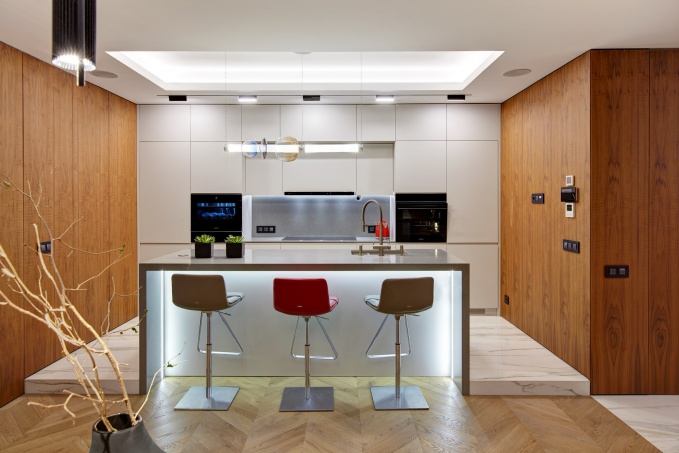 В этой московской квартире со сложной планировкой кухня расположена в нишевом помещении без окон, дневной свет проникает в кухню из гостиной через широкий оконный проем в стене. Со стороны гостиной возле импровизированного окна располагается барная стойка, со стороны кухни – рабочая зона с мойкой. Монохромный интерьер кухни строится на цветовом контрасте белого мрамора в отделке пола, стен, столешницы и мебельных фасадов, финишированных черным лаком. Мебель для кухни из массива в стиле современной британской классики – Christopher Peacock (США).