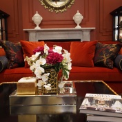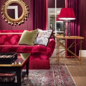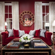 ДальшеГостиная в красном цвете – необычное, роскошное и на удивление уютное интерьерное решение. Главное в создании такого камерного классического салона – избежать излишнего дворцового пафоса, в чем помогает колониальная эстетика, а чтобы снизить «кровяное давление», лучше всего использовать теплые оттенки красного – терракотовый, апельсиновый, гранатовый, алый. Дополнительно визуально разгрузить картину помогают светлый паркет, а также контраст черных лакированных и белых матовых поверхностей. Интерьер гостиной набран из мебельной коллекции Alexa Hampton by Theodore Alexander.