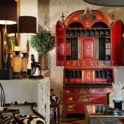 Приобрести готовую интерьерную композицию из наличия в московском салоне – и такую услугу предоставляет своим заказчикам галерея Charles.Cameron. Эта дизайнерская композиция для прихожей решена в азиатском стиле и включает четыре позиции. Невероятно стильный деревянный комод Desert Chest с ручной резьбой под кожу крокодила от Theodore Alexander, бронзовый светильник в виде дракона, пара подсвечников с фениксами из темной бронзы, двухцветная шкатулка из наборного дерева с рисунком «арлекин». Традиционная восточная тема в трактовке американских производителей «звучит» достаточно аутентично и вместе с тем по-западному сдержанно и элегантно. При желании композицию можно дополнить гравюрой в золоченой раме.