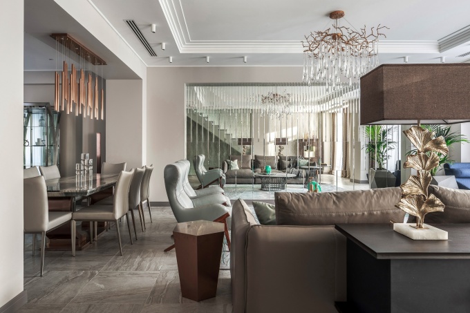 «Когда мы в первый раз оказались на объекте, то подумали, что едва ли получится что-то интересное… Но, как только убрали перегородки, то внутренний объем заработал совсем по-другому, возникло ощущение большого пространства: логичного и цельного», - рассказывает автор проекта. Комфортное пространство с открытой структурой стало базой для респектабельного интерьера с приглушенной цветовой гаммой, приятными на ощупь материалами и обволакивающей атмосферой.