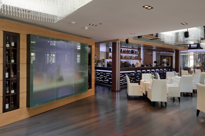 С той лишь разницей, что из панорамных окон открывается впечатляющий вид на московскую перспективу начала XXI века. Перед дизайнером Юной Мегре, создавшей этот яркий и стильный интерьер, стояла непростая задача – декорировать пространство, доставшееся от отеля For Seasons, который сначала планировал открываться на этом месте. Именно от него остались роскошные, но столь разноплановые элементы: входные двери в стиле ар-деко из металла, полы из древесины оливы, настенные панели из шпона березы, эбенового дерева и замши, зеркала из гранита, более двух десятков живых берез в кадках и огромное холодное пространство под высочайшим стеклянным куполом… Важно было не просто соединить декоративные элементы в цельный ансамбль, но создать атмосферу уюта в большом открытом стеклянном объеме.